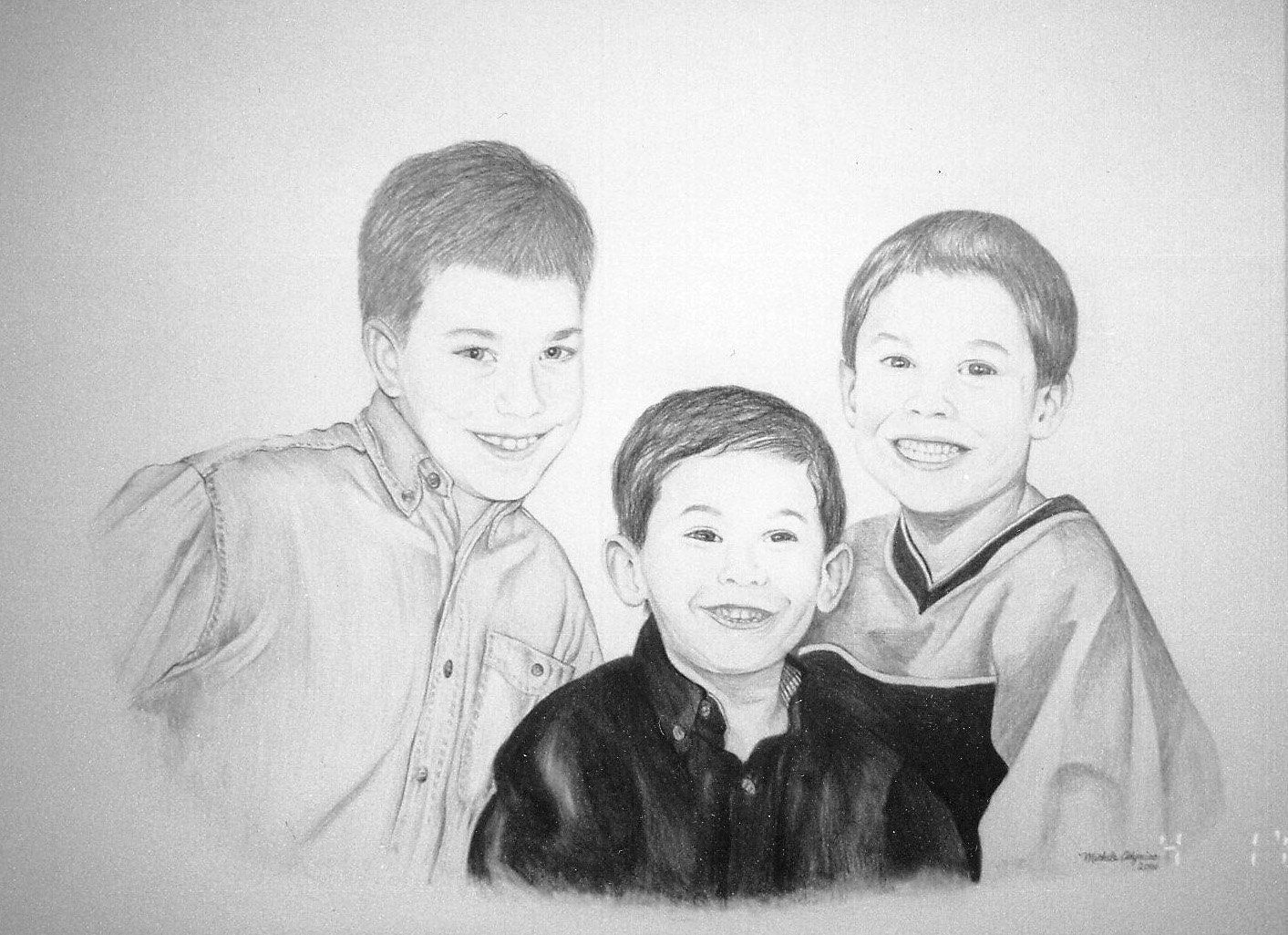 To create a piece of art, Michele works best from photographs. The photograph a client chooses should capture the personality of the subject and demonstrate great expression. Michele can use one or several photos together to accurately portray the subject and enhance the drawing. (Combining a particular head with a particular body is not uncommon). Michele can also suggest different backgrounds, settings, etc. She can draw large complex drawings with many people, or just one subject. Clients will speak with Michele to clarify goals and artistic desires for the finished product. She has the ability and talent to meet expectations.